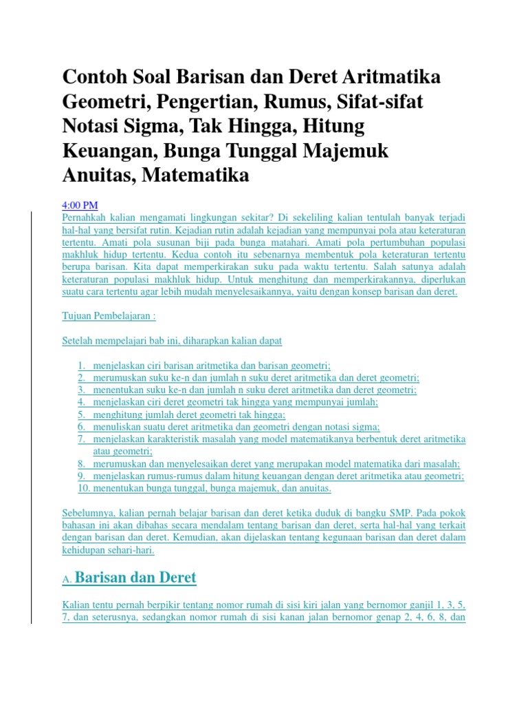 Pada barisan geometri terdapat lima besaran yaitu a, p, n, un dan sn. Barisan geometri adalah barisan yang memiliki perbandingan tetap pada tiap dua suku berurutannya, yang membedakan dengan barisan aritmatika adalah pada barisan aritmatika memilliki contoh soal 5. Bila pada pengamatan hari kedua adalah 2 cm dan pada hari keempat adalah 3. Tentukan u8 dari barisan tersebut. Lalu apa perbedaan antara barisan dan deret geometri ?. Apa sih barisan geometri itu?