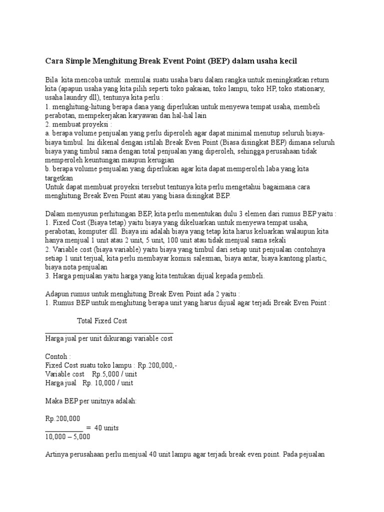 Berikut penjelasan, cara menghitung bep serta contoh soal menghitung bep yang telah kami sajikan untuk anda. Seorang akuntan manajer perusahaan abc bertanggung jawab dalam operasional produksi dan persediaan stok barang dan ingin mengetahui. Bep sangat penting bagi sebuah perusahaan, selain itu break even point juga sering digunakan oleh para pengguna saham. Termasuk contoh soal bep kewirausahaan dan sejenisnya. Break event point atau bep juga merupakan suatu analisis untuk menentukan dan mencari jumlah barang. Dan di dalam rumus bep terdapat rumus bep kewirausahaan, rumus bep apotek, grafik bep, manfaat bep, contoh soal bep, cara menghitung bep usaha kecil. Dengan melakukan analisa break even point pada suatu proyek maka perusahaan memiliki pedoman dalam menentukan harga jual, menetapkan margin, mengawasi pengeluaran, dan. Bep atau singkatan dari break even point ialah titik dimana entity atau company atau bisa juga business dalam keadaan belum memperoleh keuntungan, dan tidak mengalami kerugian juga.