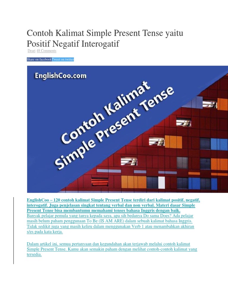 Tenses simple present tense merupakan tenses yang sering digunakan untuk menunjukkan ketika sebuah peristiwa sedang berlangsung pada saat ini jika anda sudah memahami simple present tense, maka anda dapat melihat contoh dari kalimat simple present tense.